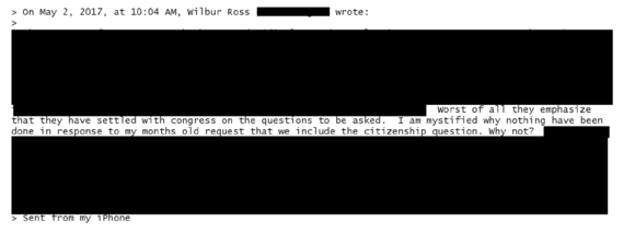 Less than one month after his Bannon-initiated conversation with an unnamed person about the Census, Secretary Ross was already exasperated that a citizenship question had not yet been added to the census. On May 2, 2017, Secretary Ross wrote an email to an aide stating that he was “mystified why nothing have [sic] been done in response to my months old request that we include the citizenship question.” [Emphasis mine]